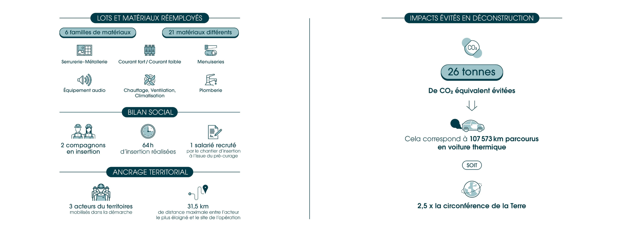 4 tonnes de matières préservée et détournée de la benne ; 2 tonnes de CO² équivalent évitées à l'échelle de l'opération (grâce à la dépose sélective) ; 24 tonnes de CO² vont être évitées par les repreneurs en intégrant de nouveau ces matériaux