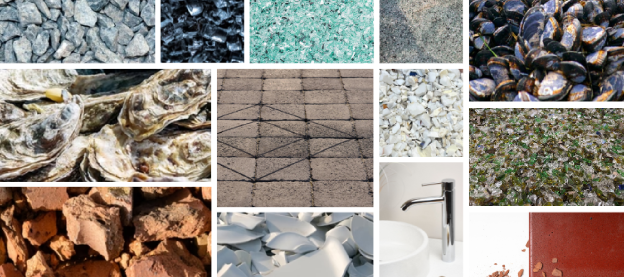 Pour la fabrication de ses produits, Wasterial® utilise des matériaux tels que la porcelaine, les coquilles de moules et d'huîtres, le sable de fonderie, la brique, le verre de bouteilles, le verre bleu, et la pierre bleue.